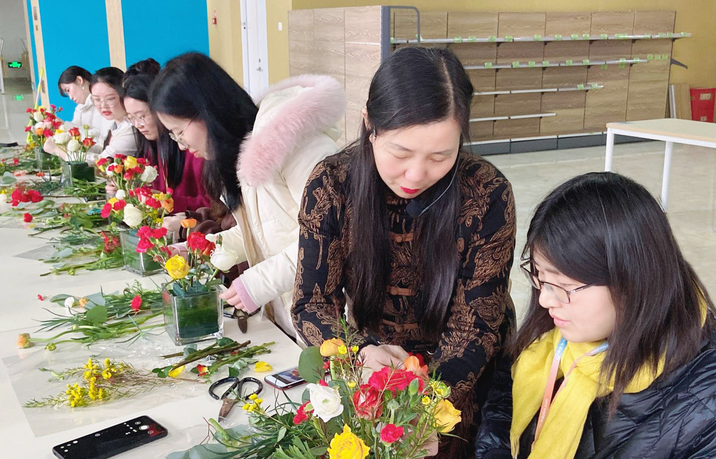花藝老師通過現場教學,讓大家欣賞了不同的插花風格,詳細介紹了花材的品種、插花的原則和技巧,并指導大家如何進行選材和制作插花等。