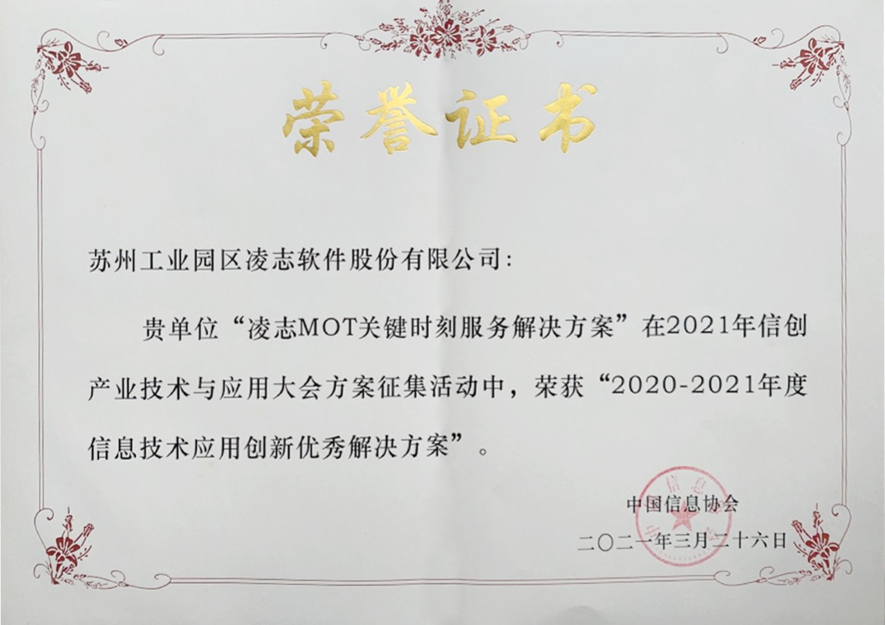 凌志軟件明星產品:MOT關鍵時刻服務解決方案亮相大會,并榮獲大會頒發的“2020-2021年度信息技術應用創新優秀解決方案”獎。