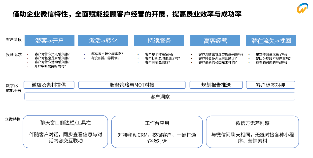 當下,中國財富管理市場已步入黃金發展期,各類金融機構基于自身資源稟賦同臺共舞。對于券商來說,財富管理的核心能力之一就是投顧能力的建設?!叭滞丁⑵叻诸櫋?,“投”是開始,“顧”才是核心。這就要求,券商投顧業務和客戶之間需要建立長期的了解、聯接和服務關系。但在當前的業務生態下,券商在實際開展業務過程依舊面臨著渠道獲客、智能營銷、客戶服務等多方面的難點。